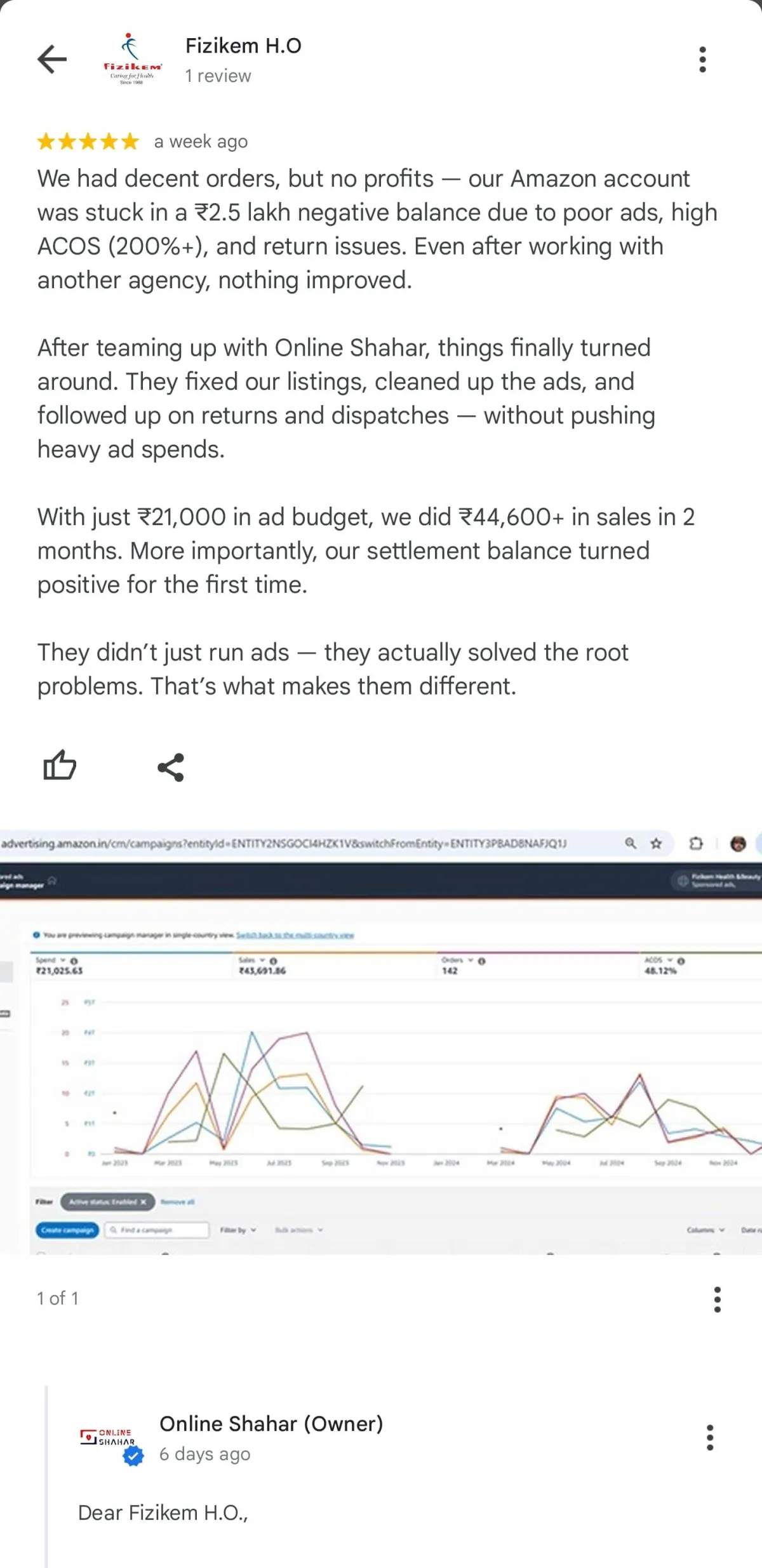 Within 2 months, just ₹21,000 in ads brought in ₹44,600+ in sales and flipped the account into a positive settlement.